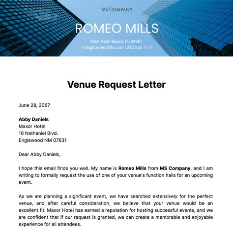 Venue Request Letter Template - Enhance this design & content with free ai. Customize and download this venue request letter . Craft a compelling appeal to host your event at no cost. Download now and start planning! The letter should be addressed formally to the relevant authority and include the date of the event,.